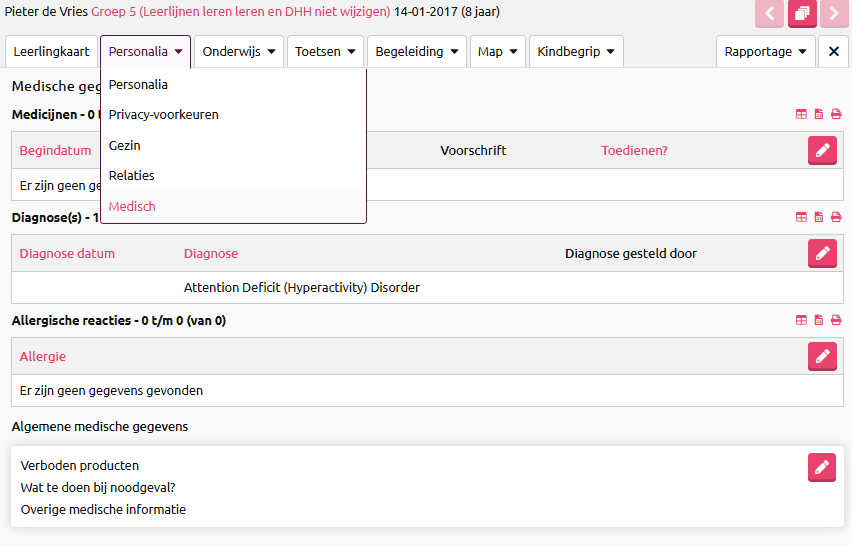 Tip: gebruik de velden die er al zijn. Medische gegevens noteer je in het veld ‘medisch’ onder kopje Personalia. Zet de kolom Medische gegevens ook "aan" op de groepskaart m.b.v. de kolommenkiezer. Zo zie je direct bij welke leerlingen er medische gegevens zijn ingevuld.