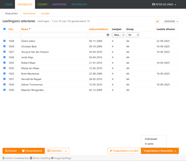 Wanneer de leerlingen de vragenlijst gaan invullen, moet je eerst de juiste lijst klaarzetten. Dit doe je eenvoudig in 1x via de knop klaarzetten in serie.