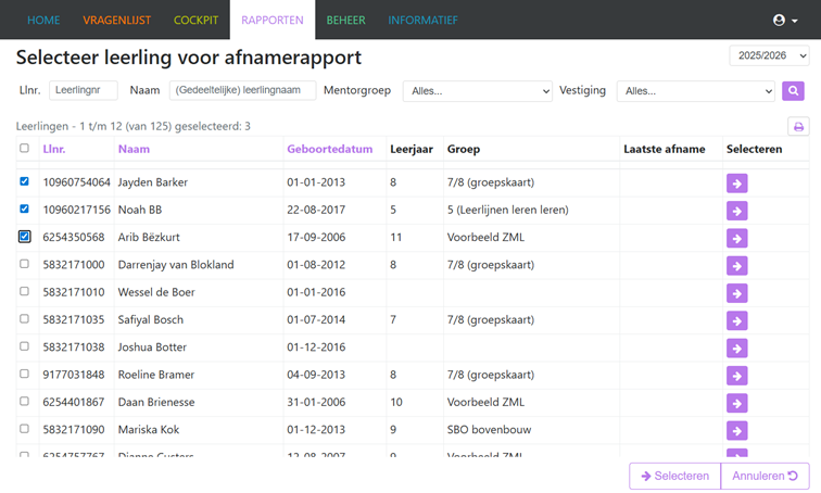 Wist je dat je het afnamerapport in één keer voor meerdere leerlingen kunt opvragen? Ga naar RAPPORTEN, zet een vinkje voor de namen van de leerlingen en klik onderaan op à Selecteren. Kies de juiste vragenlijst en klik op Verder. Er wordt nu een Zip-map gedownload waarin alle vragenlijsten van de leerlingen zitten. Dit maakt je werk een stuk lichter!